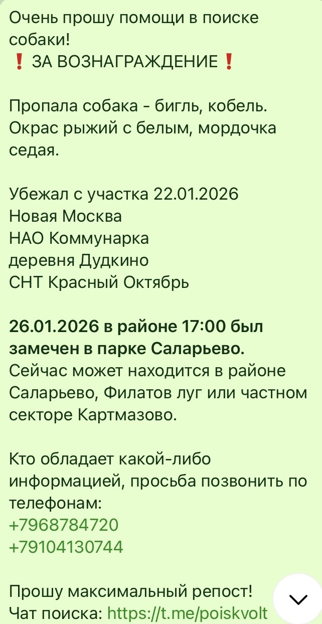 - распространите пост в интернете: в ВКонтакте, Телеграм и на других ресурсах - в породных группах, в группах поиска потеряшек, на страничках и чатах округа, ближайших домовых чатах и на личных страничках.
